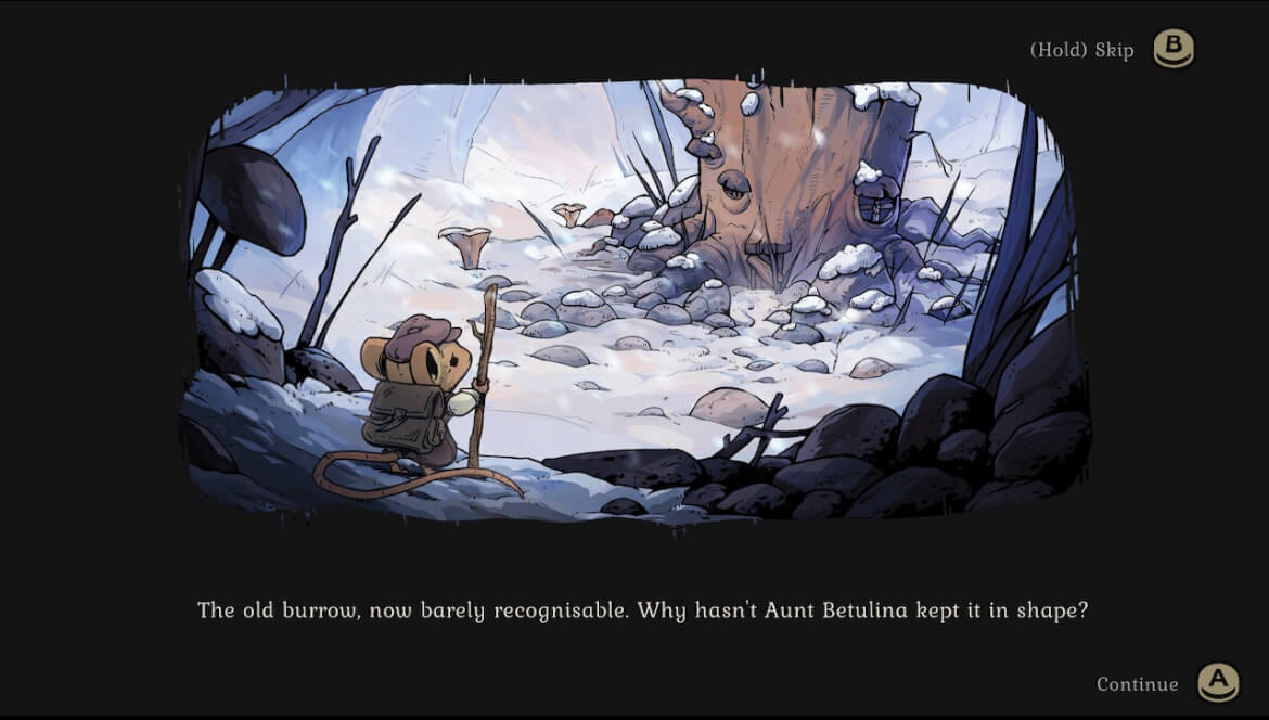 In Winter Burrow übernehmt ihr die Rolle einer kleinen Maus, die nach Jahren in der hektischen Stadt in ihre Heimat zurückkehrt. Doch statt eines behaglichen Familienbaus findet sie ein verfallenes Zuhause vor – und die Tante, die eigentlich auf den Bau aufpassen sollte, ist spurlos verschwunden.