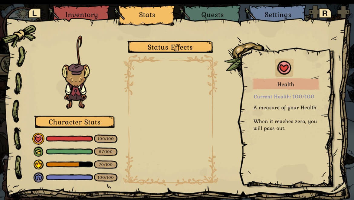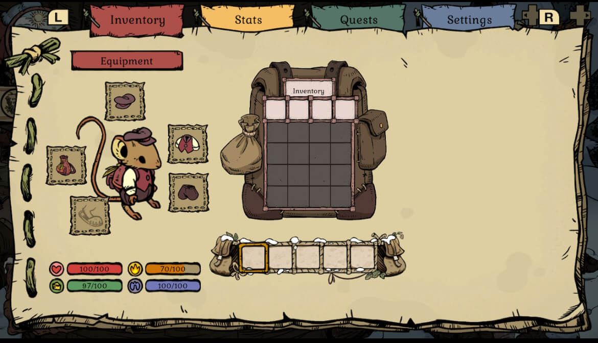 Das Interface wirkt wie aus Pergament gefertigt, die Menüs sind übersichtlich und mit verspielten Symbolen gestaltet. Die Animationen sind weich, das Charakterdesign charmant. Besonders die Maus mit Rucksack und Wanderstab ist ein echter Sympathieträger. Auch die Musik ist ein Highlight, die euch beim Erkunden und Werken begleitet. Je nach Situation verändert sich die Tonkulisse: friert ihr oder habt ihr keine Ausdauer mehr, hört ihr das angestrengte Atmen der Maus.