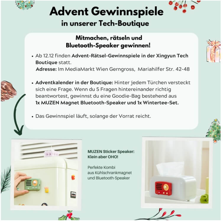 Die Adventzeit ist klassisch geprägt von drei Dingen: Last Christmas von Wham, Stress und Gewinnspielen bzw. Adventkalendern (wie auch dem BeyondPixels-Adventkalender). Der internationale Tech-Anbieter Xingyun, der Mitte Oktober eine Tech-Boutique innerhalb des neuartigen MediaMarkt Tech-Village im Gerngross eröffnete, will hier um nichts nachstehen und lädt zu Rätselgewinnspielen im Store ein. Ab heute können alle Shopbesucher:innen mitmachen und mit etwas Glück ein Advent-Goodiebag mit einem Muzen Magnet Bluetooth-Speaker sowie einem Wintertee-Set abstauben. Wie das geht? Das erfahrt ihr gleich hier: